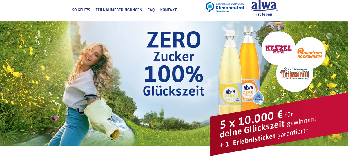 Ein Gewinnspiel, das beim Kauf einer Kiste alwa ZERO und dem Hochladen des Kassenbons eine garantierte Prämie bietet. Teilnehmer erhalten ein Erlebnisticket und nehmen an der Verlosung von fünf Hauptgewinnen von je 10.000 € teil.
