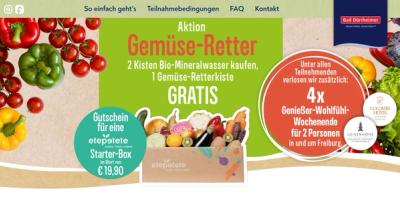 Die Aktion bietet beim Kauf von zwei Kisten Bad Dürrheimer Bio Mineralwasser eine kostenlose Gemüse-Retter Starter-Box von etepetete. Diese Kombination aus Giveaway und Verlosung sorgt für hohe Teilnehmerzahlen.