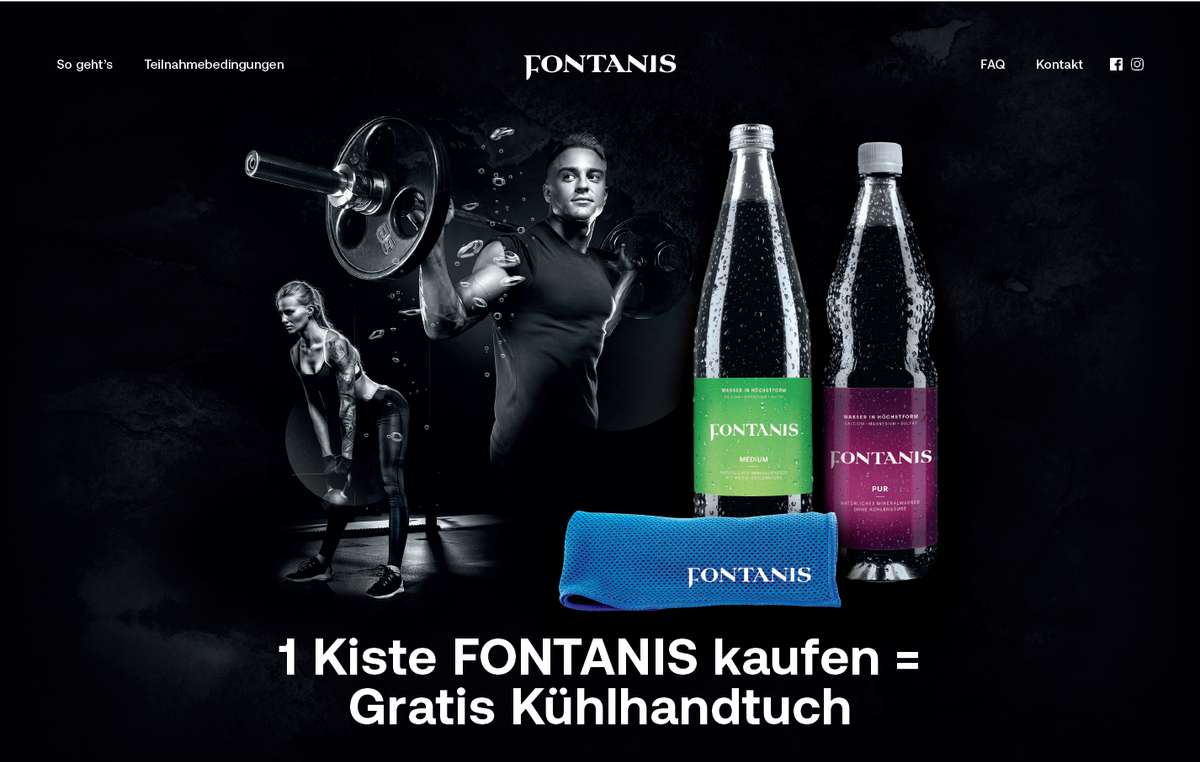 Die Aktion bietet beim Kauf von FONTANIS Mineralwasser ein kostenloses Kühlhandtuch. Die klare Kommunikation und die attraktive Prämie wecken das Interesse der Zielgruppe.