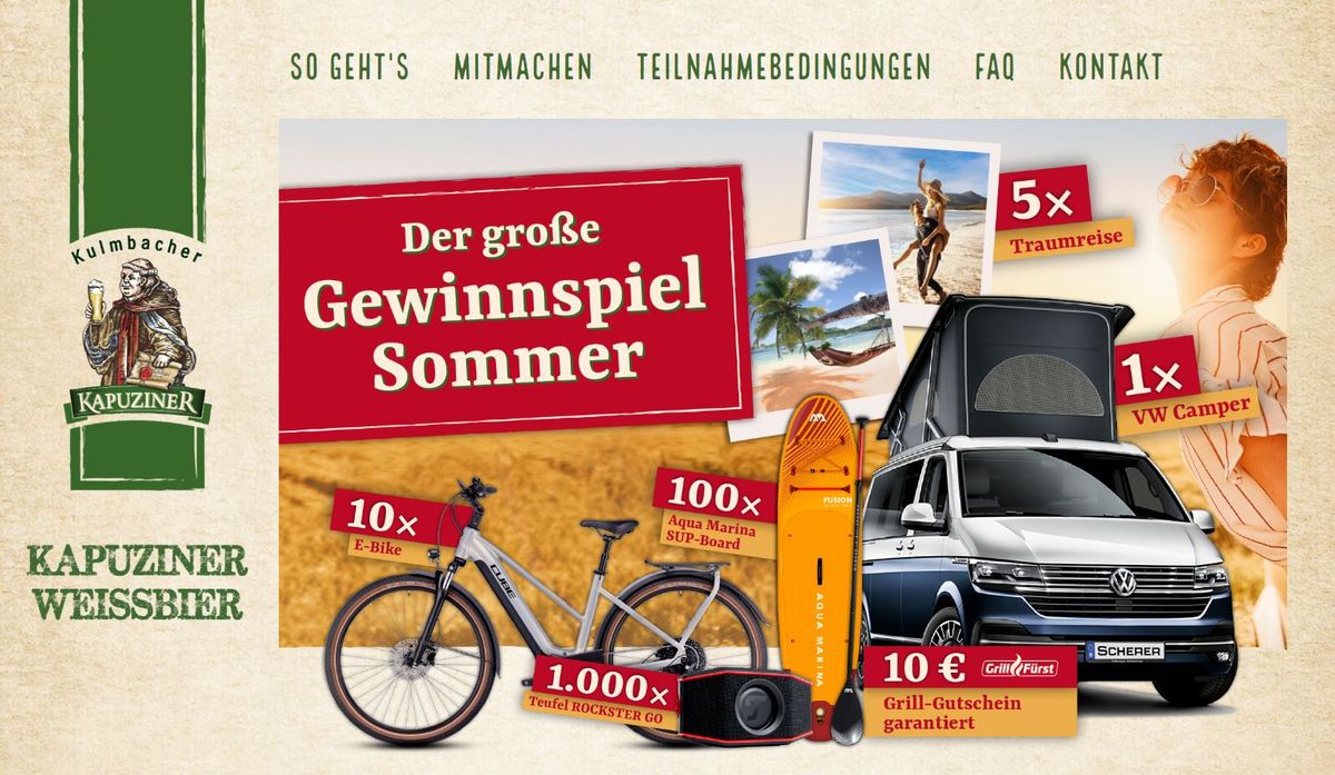Mit VW, Cube, Aqua Marina, Teufel und Grillfürst hat Viva Marketing für Kapuziner die perfekten Kooperationspartner an Bord geholt und ein Gewinnspiel entwickelt, das sofort Sommergefühl vermittelt. Durch die spezielle Code-Mechanik konnten Gewinne im Gesamtwert von 400.000 € ausgelobt werden – ein außergewöhnlich starker Aktivierungsimpuls. Kein Teilnehmer geht leer aus: Wer keinen Hauptgewinn zieht, erhält automatisch einen 10 € Gutschein bei Grillfürst.