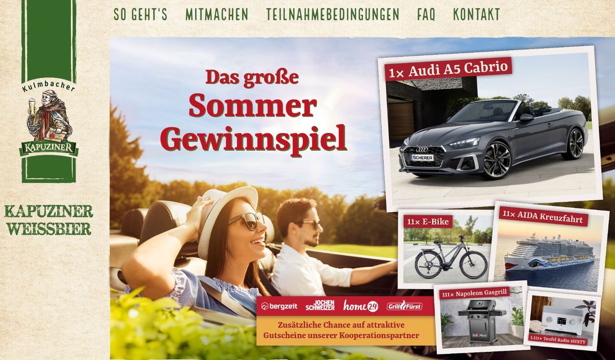 Das Kapuziner Sommer Gewinnspiel geht in die 2. Runde – sommerlicher und attraktiver denn je! Allen voran winkt der traumhafte Hauptpreis eines neuen Audi A5 Cabriolets. Weitere Hauptpreise sind AIDA Kreuzfahrten, E-Bikes, Napoleon Gasgrills und Teufel Radios. Für alle anderen gibt es attraktive Gutscheingewinne bei Jochen Schweizer, Bergzeit, home24 und Grillfürst.