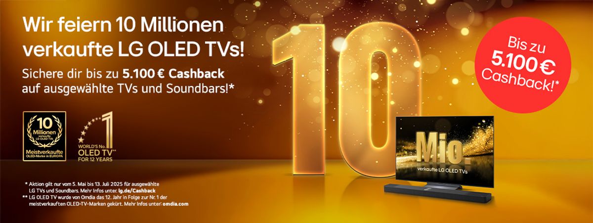 Ein runder Meilenstein – und ein runder Mechanismus: Zur Feier von über 10 Millionen verkauften OLED-TVs in Europa hat LG eine starke Verkaufsförderung ins Leben gerufen. Alle Käufer ausgewählter TVs oder Soundbar-Bundles erhalten im Aktionszeitraum bis zu 5.100 € Cashback. Die Aktion zahlt dabei nicht nur auf kurzfristige Abverkäufe ein, sondern stärkt auch die Markenbindung durch die emotionale Inszenierung eines großen Erfolgs.